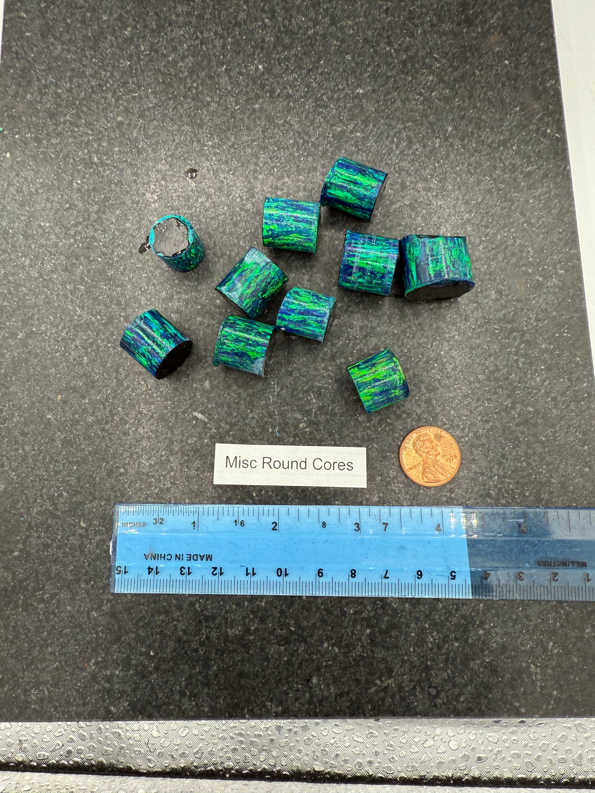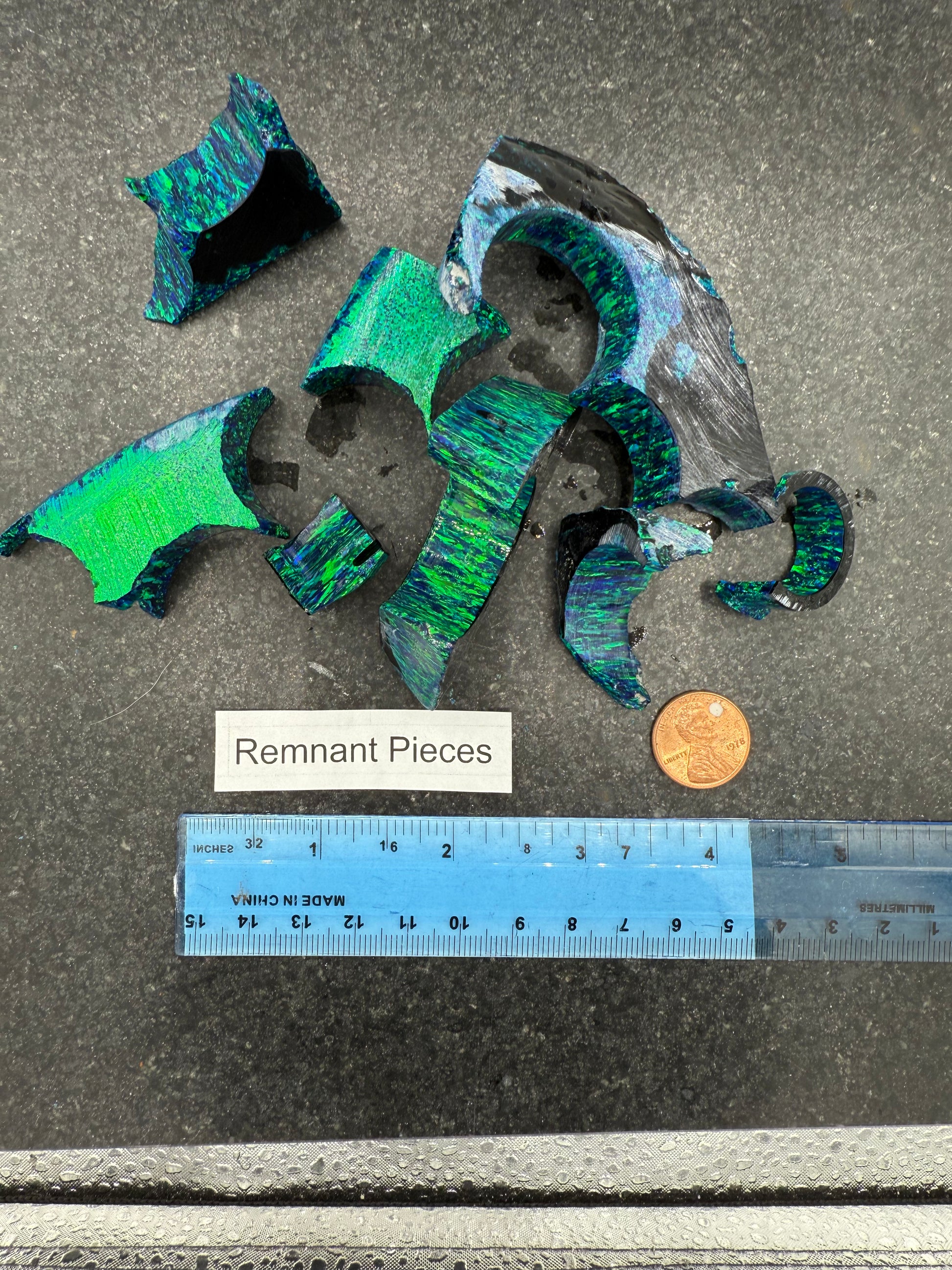 These Black Emerald remnants of lab-grown opal are created in-house and available in seven sizes. Our Black Emerald opal is dark green with bright green and dark blue undertones. Ideal for creating custom inlays in rings, pendants, pens, and other works of art.